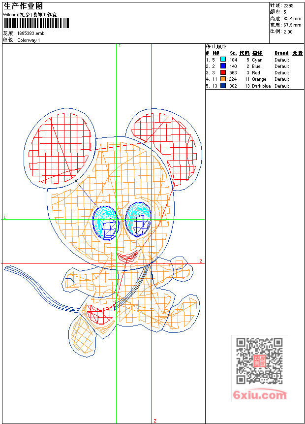 - emb花版参数: 大小:32.50 KB / 尺寸:68*85[毫米] / 针数:2395针 / 线色:5 / 格式:emb / 版本:9