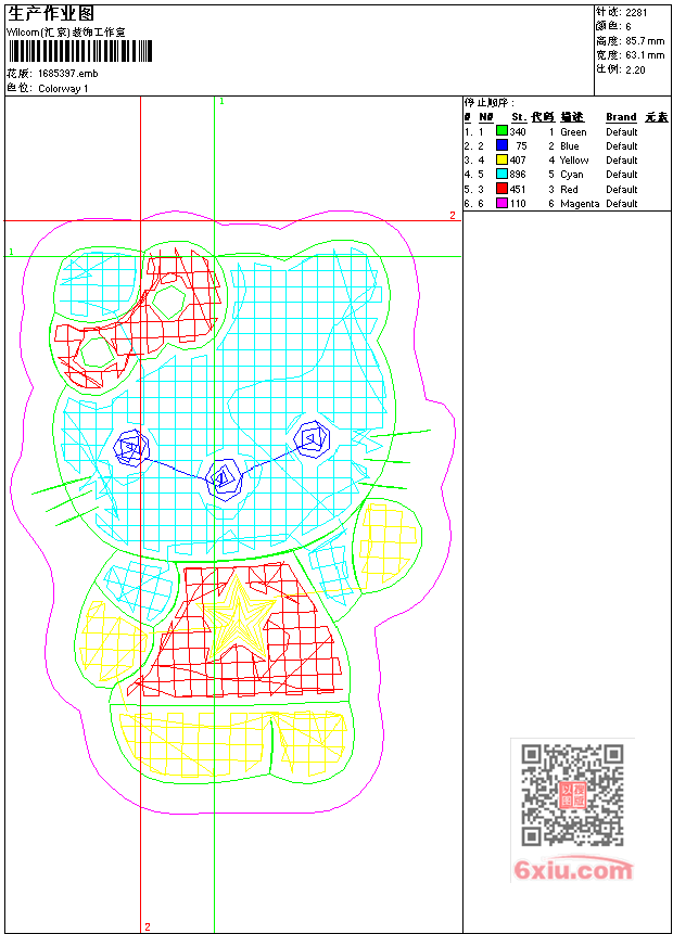 - emb花版参数: 大小:33.50 KB / 尺寸:63*86[毫米] / 针数:2281针 / 线色:6 / 格式:emb / 版本:9