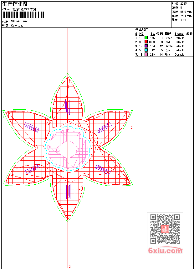 - emb花版参数: 大小:25.50 KB / 尺寸:74*85[毫米] / 针数:2235针 / 线色:5 / 格式:emb / 版本:9