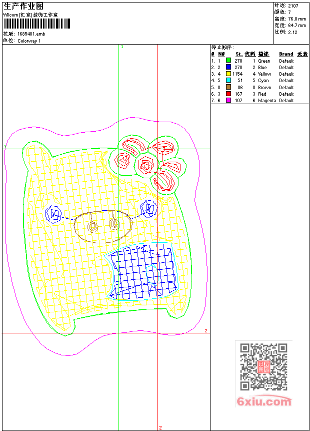 - emb花版参数: 大小:31.50 KB / 尺寸:65*76[毫米] / 针数:2107针 / 线色:7 / 格式:emb / 版本:9
