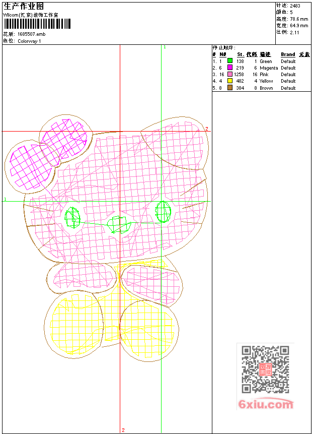- emb花版参数: 大小:29.50 KB / 尺寸:65*79[毫米] / 针数:2483针 / 线色:5 / 格式:emb / 版本:9