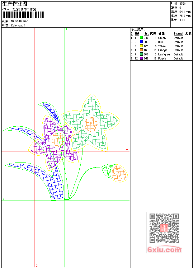 - emb花版参数: 大小:28.00 KB / 尺寸:76*64[毫米] / 针数:1558针 / 线色:6 / 格式:emb / 版本:9