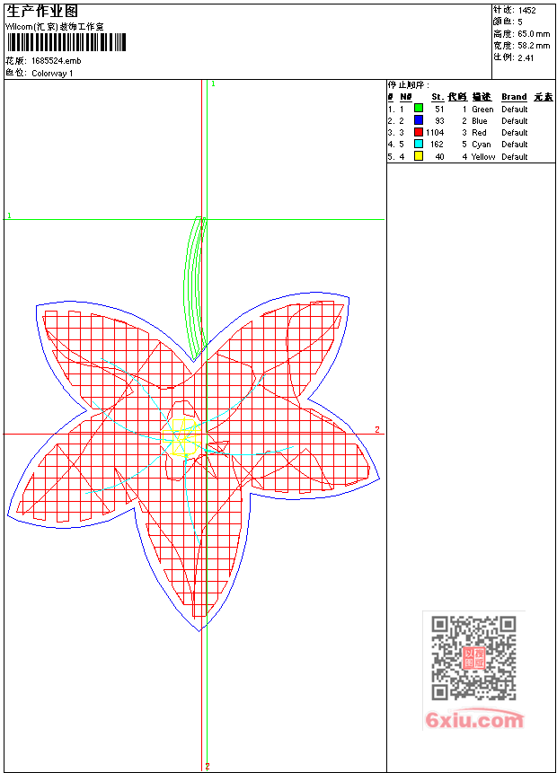 - emb花版参数: 大小:22.50 KB / 尺寸:58*65[毫米] / 针数:1452针 / 线色:5 / 格式:emb / 版本:9