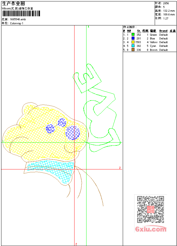 - emb花版参数: 大小:28.50 KB / 尺寸:110*132[毫米] / 针数:2856针 / 线色:5 / 格式:emb / 版本:9