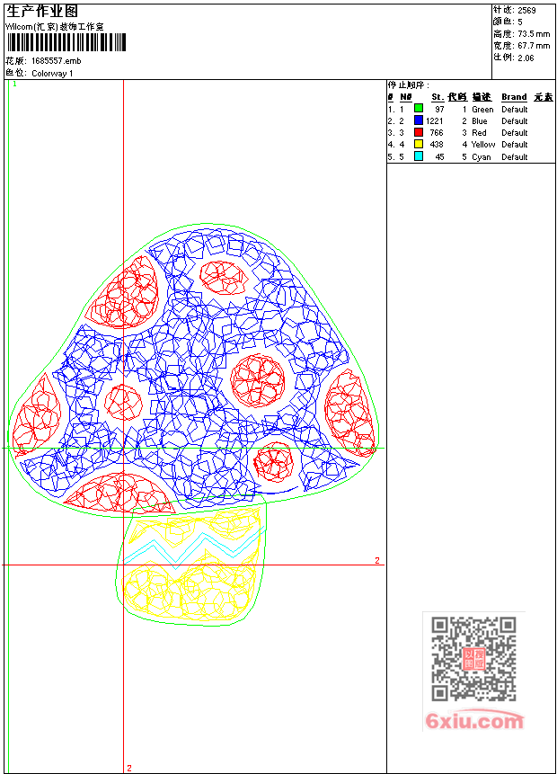 - emb花版参数: 大小:34.50 KB / 尺寸:68*74[毫米] / 针数:2569针 / 线色:5 / 格式:emb / 版本:9