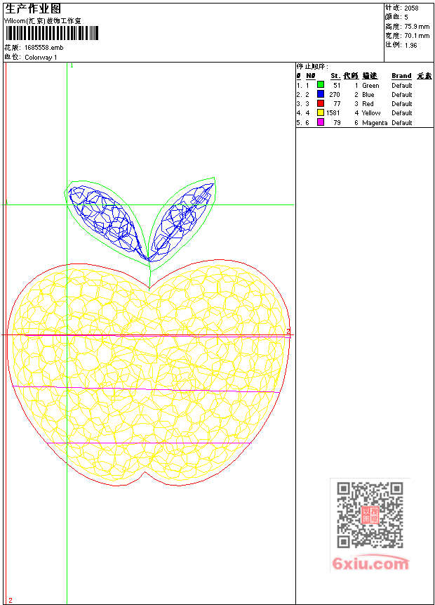 - emb花版参数: 大小:27.50 KB / 尺寸:70*76[毫米] / 针数:2058针 / 线色:5 / 格式:emb / 版本:9