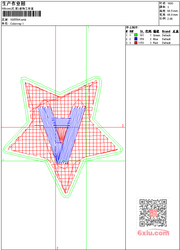 - emb花版参数: 大小:21.50 KB / 尺寸:68*69[毫米] / 针数:1693针 / 线色:3 / 格式:emb / 版本:9