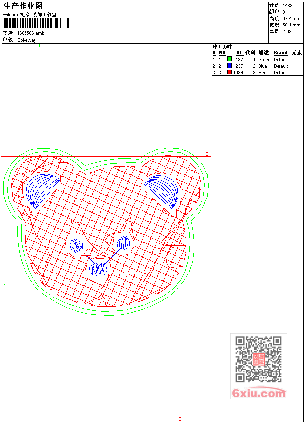 - emb花版参数: 大小:22.00 KB / 尺寸:58*47[毫米] / 针数:1463针 / 线色:3 / 格式:emb / 版本:9