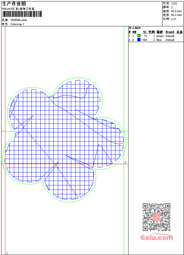 - emb花版参数: 大小:17.50 KB / 尺寸:56*57[毫米] / 针数:1232针 / 线色:2 / 格式:emb / 版本:9