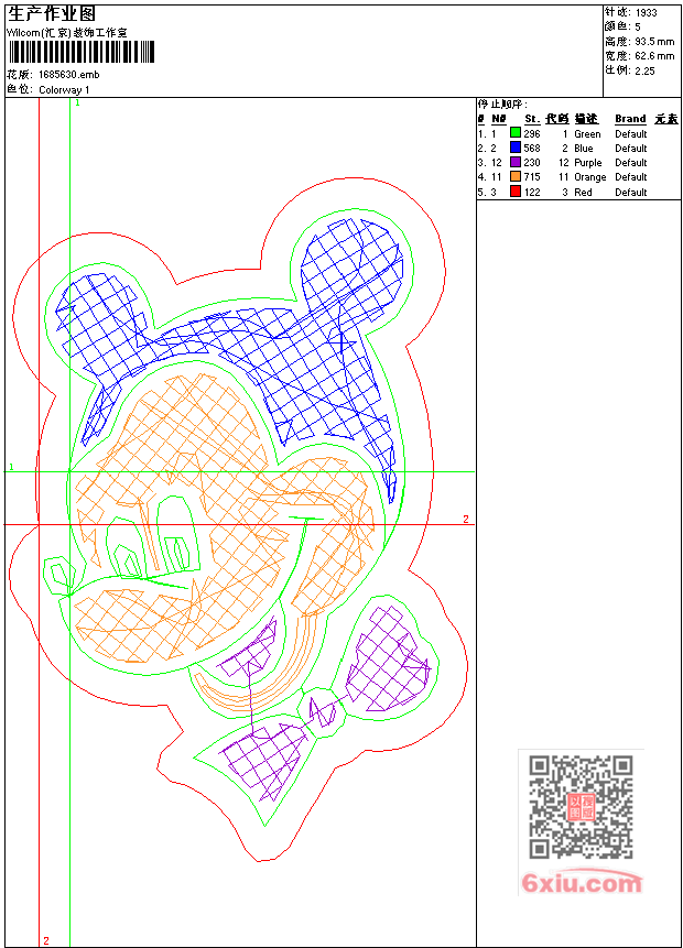 - emb花版参数: 大小:28.00 KB / 尺寸:63*93[毫米] / 针数:1933针 / 线色:5 / 格式:emb / 版本:9