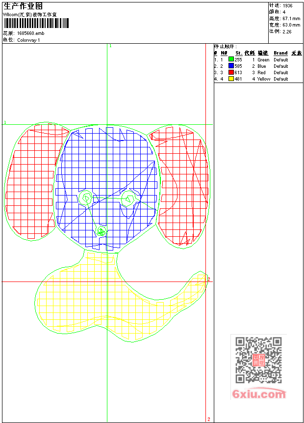 - emb花版参数: 大小:25.00 KB / 尺寸:63*67[毫米] / 针数:1936针 / 线色:4 / 格式:emb / 版本:9