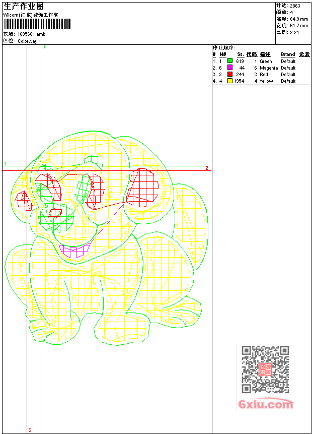 - emb花版参数: 大小:38.00 KB / 尺寸:62*65[毫米] / 针数:2863针 / 线色:4 / 格式:emb / 版本:9