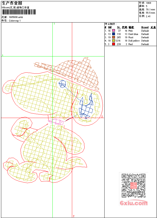 - emb花版参数: 大小:30.00 KB / 尺寸:56*70[毫米] / 针数:1869针 / 线色:5 / 格式:emb / 版本:9