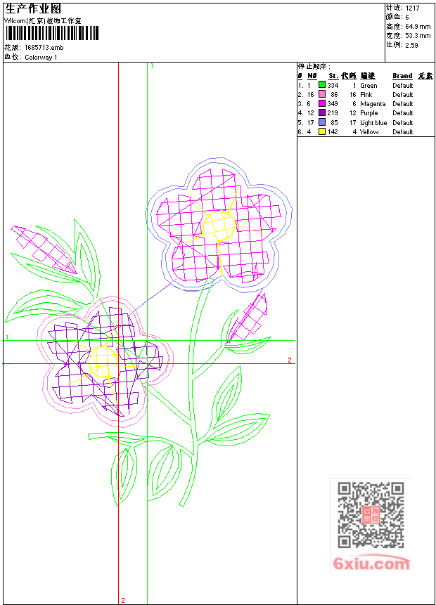 - emb花版参数: 大小:29.50 KB / 尺寸:53*65[毫米] / 针数:1217针 / 线色:6 / 格式:emb / 版本:9