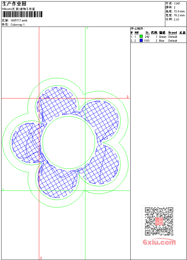 - emb花版参数: 大小:20.50 KB / 尺寸:70*72[毫米] / 针数:1347针 / 线色:2 / 格式:emb / 版本:9