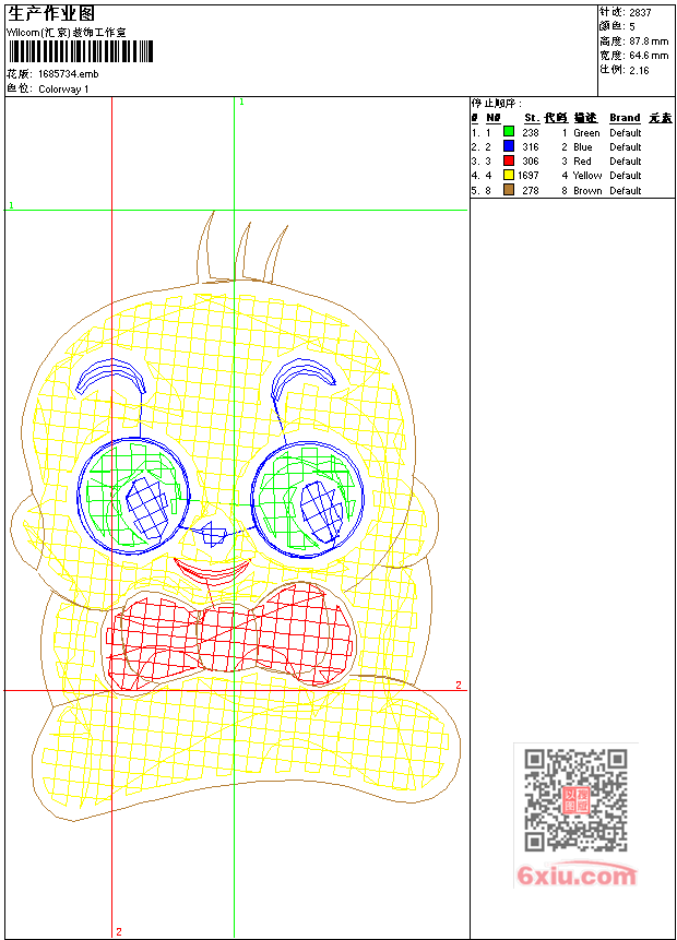 - emb花版参数: 大小:32.50 KB / 尺寸:65*88[毫米] / 针数:2837针 / 线色:5 / 格式:emb / 版本:9