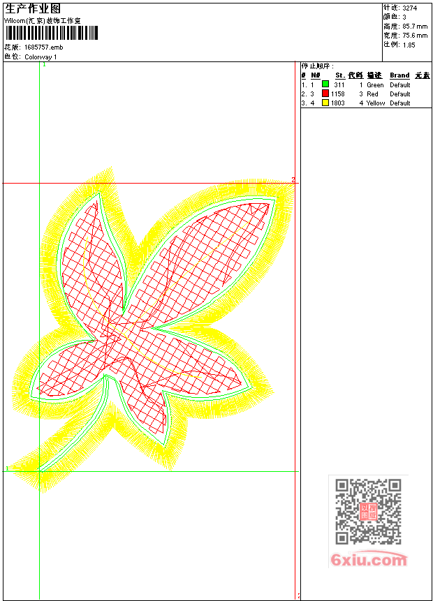 - emb花版参数: 大小:33.50 KB / 尺寸:76*86[毫米] / 针数:3274针 / 线色:3 / 格式:emb / 版本:9