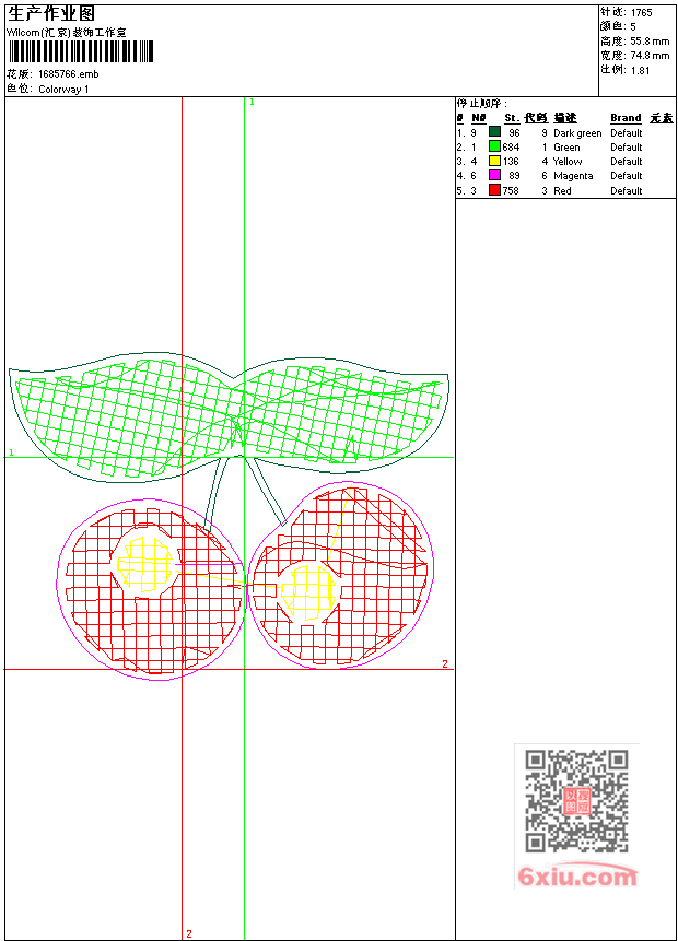 - emb花版参数: 大小:24.00 KB / 尺寸:75*56[毫米] / 针数:1765针 / 线色:5 / 格式:emb / 版本:9