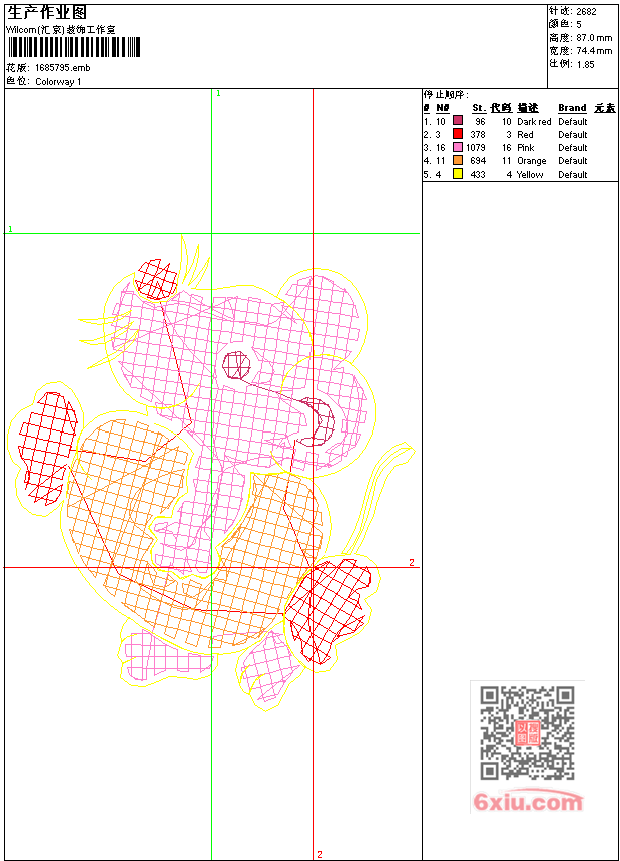 - emb花版参数: 大小:32.50 KB / 尺寸:74*87[毫米] / 针数:2682针 / 线色:5 / 格式:emb / 版本:9