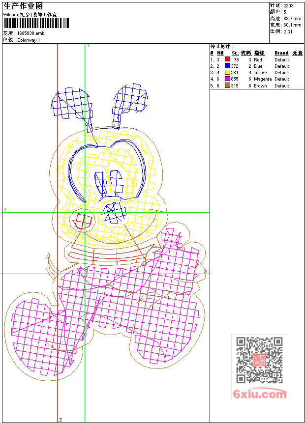 - emb花版参数: 大小:32.00 KB / 尺寸:60*89[毫米] / 针数:2203针 / 线色:5 / 格式:emb / 版本:9