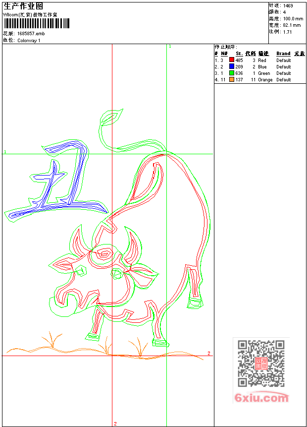- emb花版参数: 大小:30.00 KB / 尺寸:82*100[毫米] / 针数:1469针 / 线色:4 / 格式:emb / 版本:9