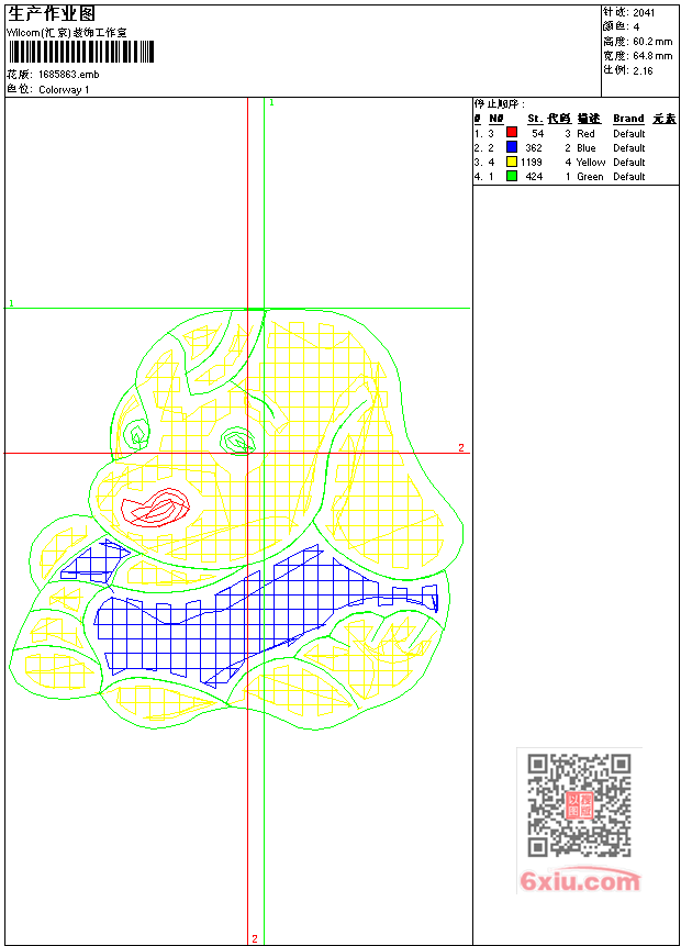 - emb花版参数: 大小:32.50 KB / 尺寸:65*60[毫米] / 针数:2041针 / 线色:4 / 格式:emb / 版本:9