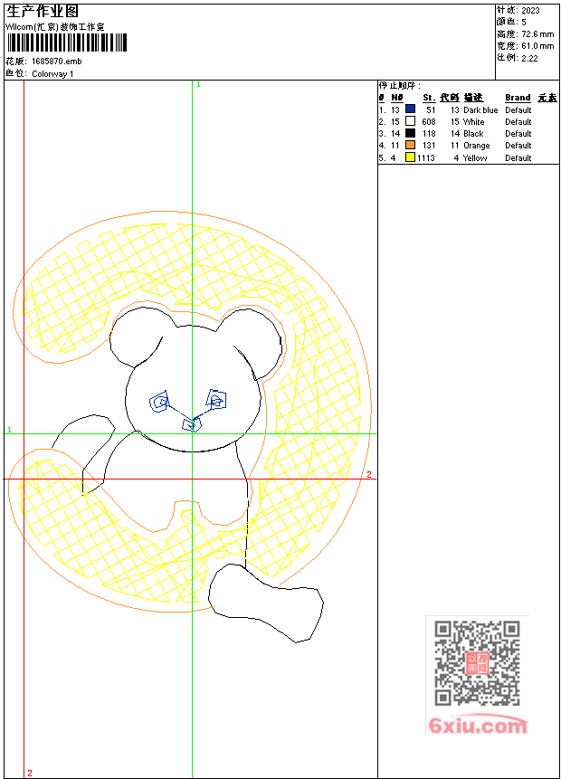 - emb花版参数: 大小:27.50 KB / 尺寸:61*73[毫米] / 针数:2023针 / 线色:5 / 格式:emb / 版本:9
