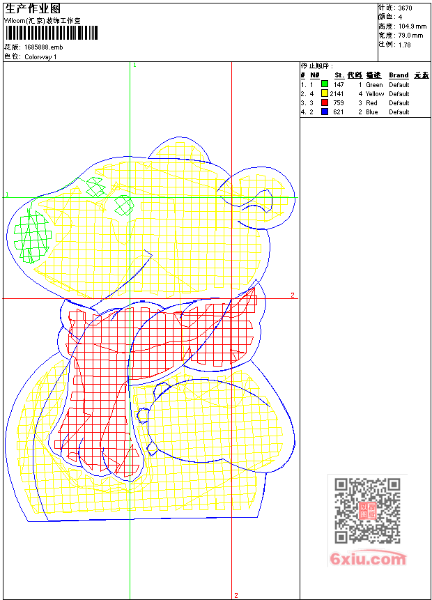 - emb花版参数: 大小:29.50 KB / 尺寸:79*105[毫米] / 针数:3670针 / 线色:4 / 格式:emb / 版本:9