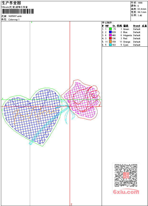 - emb花版参数: 大小:27.00 KB / 尺寸:94*63[毫米] / 针数:1998针 / 线色:6 / 格式:emb / 版本:9