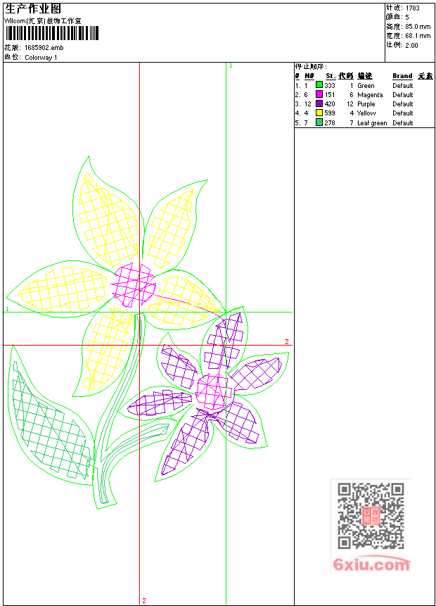 - emb花版参数: 大小:28.00 KB / 尺寸:68*85[毫米] / 针数:1783针 / 线色:5 / 格式:emb / 版本:9