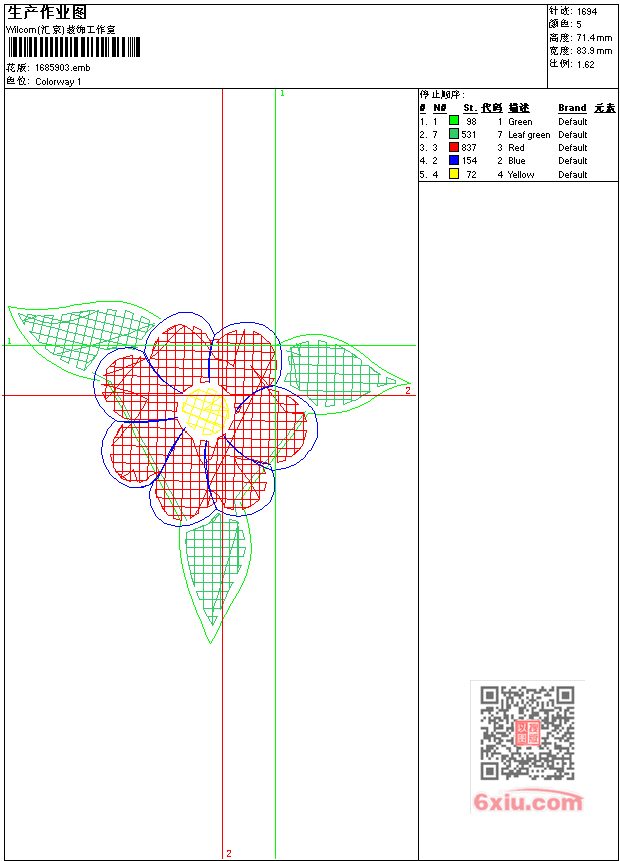 - emb花版参数: 大小:25.00 KB / 尺寸:84*71[毫米] / 针数:1694针 / 线色:5 / 格式:emb / 版本:9