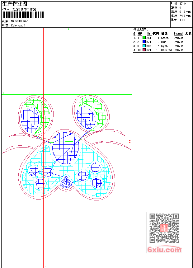 - emb花版参数: 大小:28.00 KB / 尺寸:74*62[毫米] / 针数:1749针 / 线色:4 / 格式:emb / 版本:9