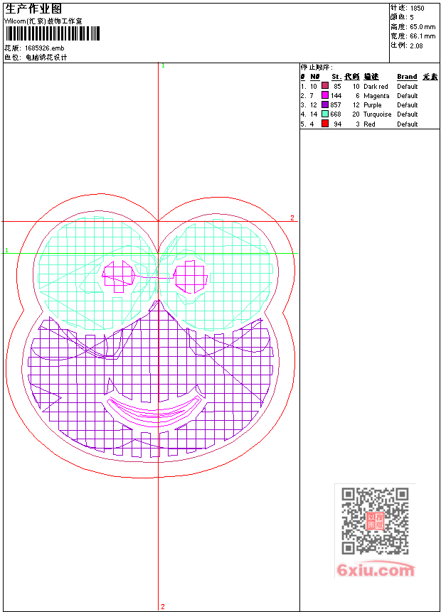 - emb花版参数: 大小:24.50 KB / 尺寸:66*65[毫米] / 针数:1850针 / 线色:5 / 格式:emb / 版本:9