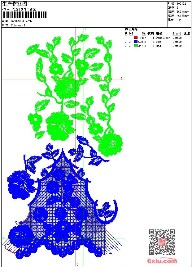 - emb花版参数: 大小:160.00 KB / 尺寸:462*863[毫米] / 针数:100122针 / 线色:3 / 格式:emb / 版本:9