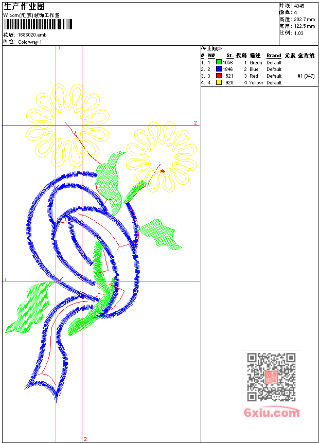 - emb花版参数: 大小:29.50 KB / 尺寸:123*203[毫米] / 针数:4345针 / 线色:4 / 格式:emb / 版本:7