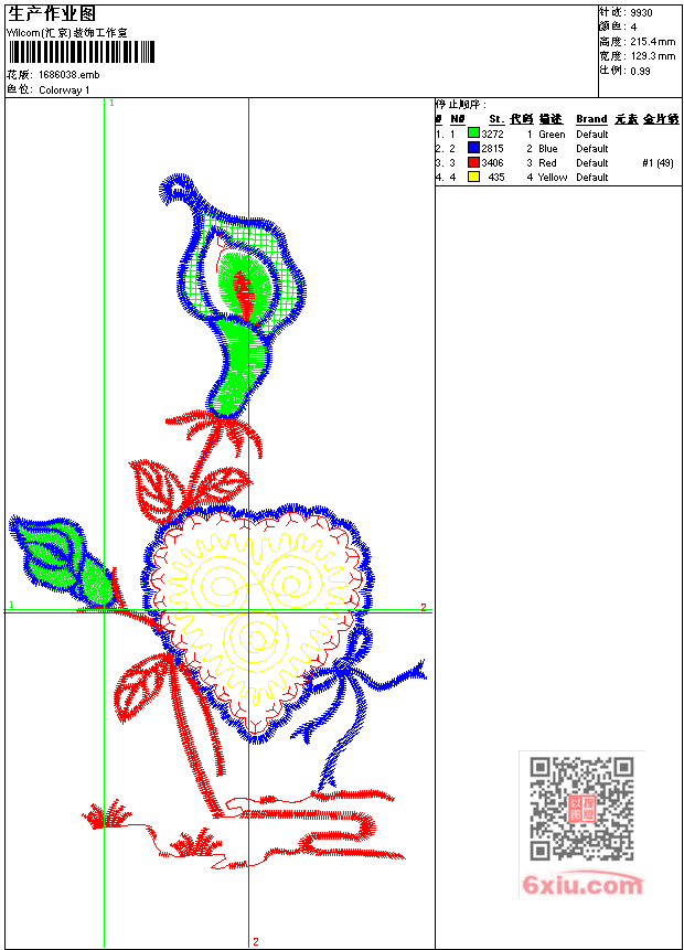 - emb花版参数: 大小:51.00 KB / 尺寸:129*215[毫米] / 针数:9930针 / 线色:4 / 格式:emb / 版本:7