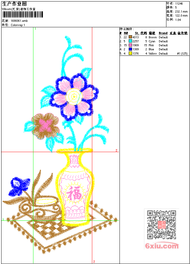 - emb花版参数: 大小:112.00 KB / 尺寸:122*232[毫米] / 针数:11246针 / 线色:5 / 格式:emb / 版本:7