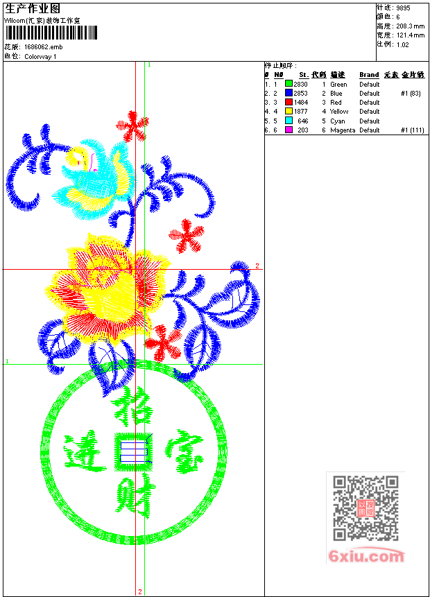 - emb花版参数: 大小:71.50 KB / 尺寸:121*208[毫米] / 针数:9895针 / 线色:6 / 格式:emb / 版本:7