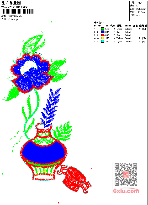 - emb花版参数: 大小:66.50 KB / 尺寸:140*252[毫米] / 针数:17564针 / 线色:5 / 格式:emb / 版本:7
