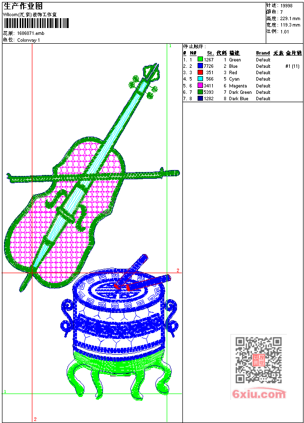 - emb花版参数: 大小:64.50 KB / 尺寸:119*229[毫米] / 针数:19998针 / 线色:7 / 格式:emb / 版本:7