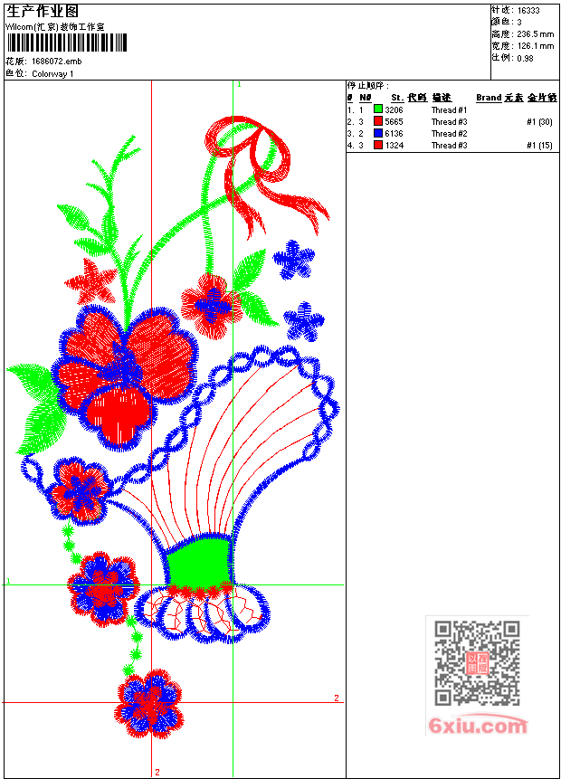 - emb花版参数: 大小:95.50 KB / 尺寸:126*237[毫米] / 针数:16333针 / 线色:3 / 格式:emb / 版本:7