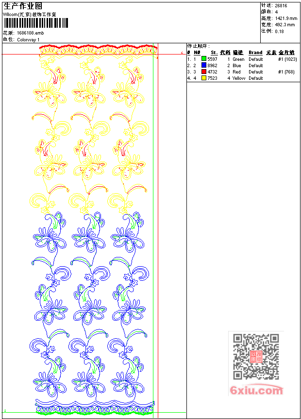 - emb花版参数: 大小:84.00 KB / 尺寸:492*1422[毫米] / 针数:26816针 / 线色:4 / 格式:emb / 版本:7