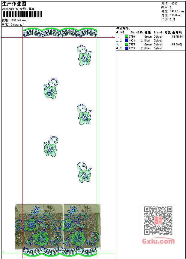 - emb花版参数: 大小:497.50 KB / 尺寸:516*1401[毫米] / 针数:16503针 / 线色:2 / 格式:emb / 版本:7