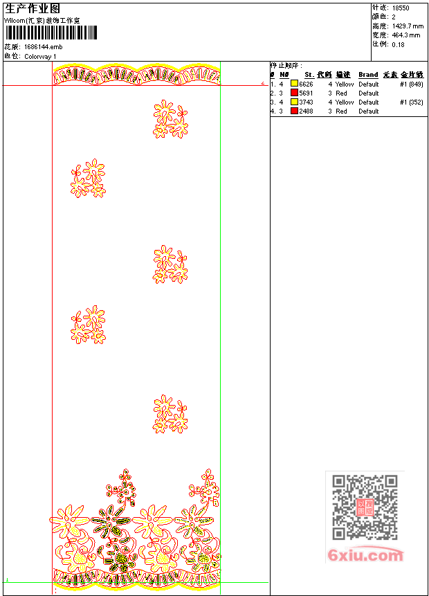 - emb花版参数: 大小:124.00 KB / 尺寸:464*1430[毫米] / 针数:18550针 / 线色:2 / 格式:emb / 版本:7