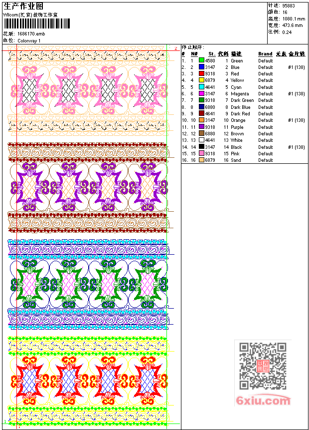 - emb花版参数: 大小:267.00 KB / 尺寸:474*1080[毫米] / 针数:95883针 / 线色:16 / 格式:emb / 版本:7