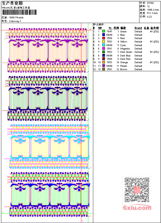 - emb花版参数: 大小:244.00 KB / 尺寸:511*1086[毫米] / 针数:87760针 / 线色:12 / 格式:emb / 版本:7