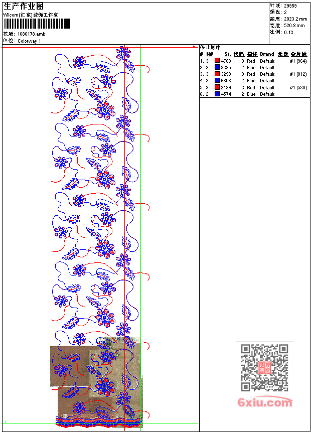 - emb花版参数: 大小:2.26 MB / 尺寸:521*2023[毫米] / 针数:29959针 / 线色:2 / 格式:emb / 版本:7
