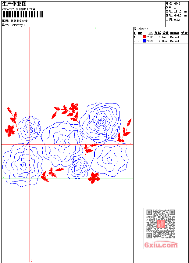 - emb花版参数: 大小:32.50 KB / 尺寸:445*291[毫米] / 针数:4763针 / 线色:2 / 格式:emb / 版本:7