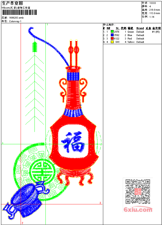 - emb花版参数: 大小:51.00 KB / 尺寸:113*220[毫米] / 针数:13333针 / 线色:4 / 格式:emb / 版本:7