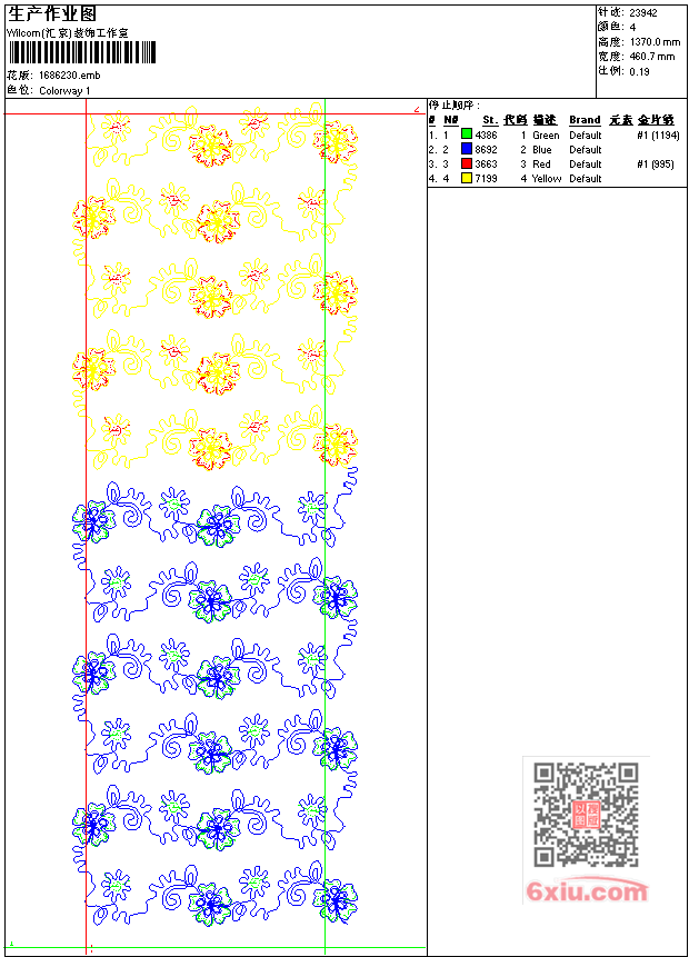 - emb花版参数: 大小:67.50 KB / 尺寸:461*1370[毫米] / 针数:23942针 / 线色:4 / 格式:emb / 版本:7